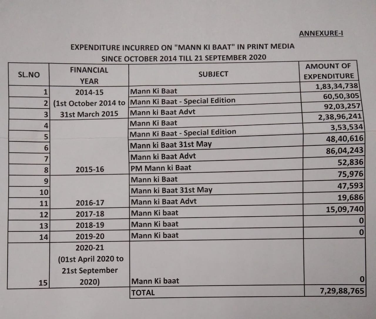 However, Mann Ki Baat, had also received criticism from various opposition parties, over the expenditure incurred during the airing of the episodes and also on its advertisement.