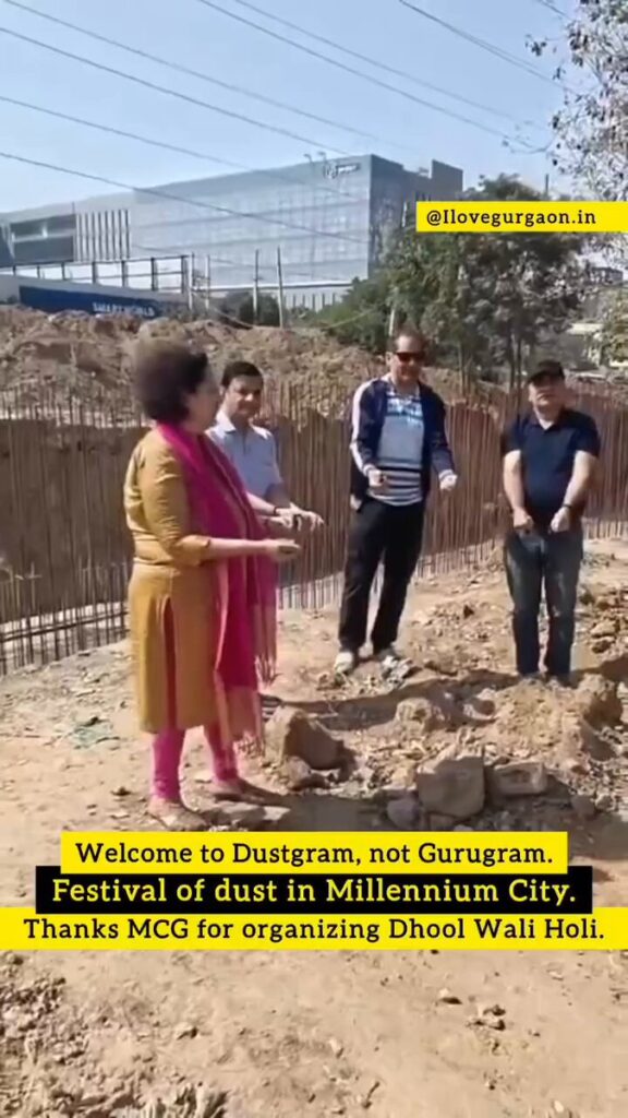 In an unusual yet powerful protest, residents of Gurugram gathered along the Southern Peripheral Road (SPR) and symbolically played Holi with dust to highlight the alarming levels of pollution caused by ongoing construction and poor road maintenance.