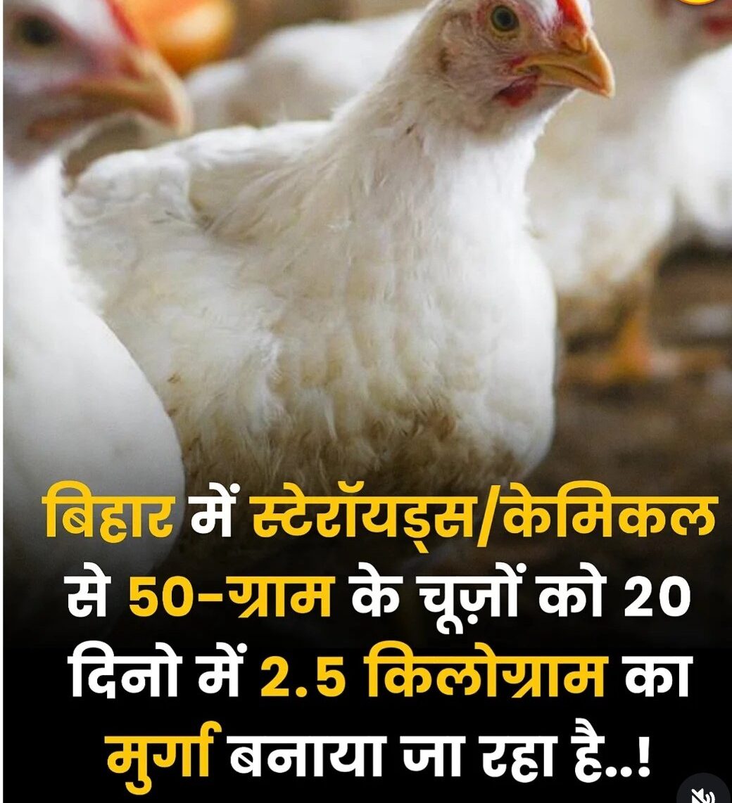 Serious concerns over food safety and public health have surfaced in Bihar following viral claims that broiler chickens are allegedly being grown using steroids and chemical substances to drastically increase their weight within an unusually short span of time. According to social media posts shared by health advocacy handles, chicks weighing barely 50 grams are reportedly being turned into 2.5-kilogram chickens within just 20 days — a practice experts warn could pose grave risks to human health if proven true.