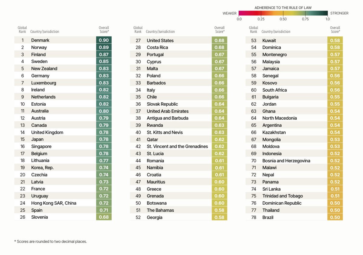 At the very top of the list stands Denmark, scoring an impressive 0.90 — making it the strongest nation in terms of rule of law. Close behind are: