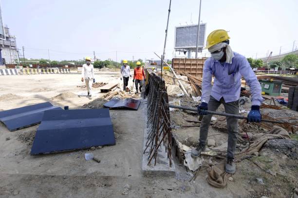 NOIDA, INDIA JUNE 9: Construction work underway ahead of preparations to open the road above the underpass at the Sector 71 intersection, on June 9, 2020 in Noida, India. (Photo by Sunil Ghosh/Hindustan Times via Getty Images)