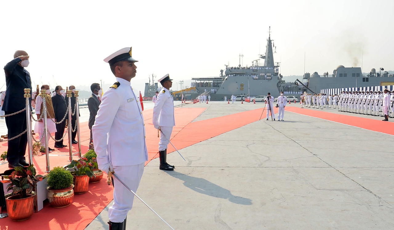 The President boarded the Presidential boat, INS Sumitra, an indigenously built Naval Offshore Patrol Vessel designated as the Presidential yacht, following a 21-gun salute and Ceremonial Guard of Honour. The President was greeted by Raksha Mantri Rajnath Singh and Chief of Naval Staff Admiral R Hari Kumar.