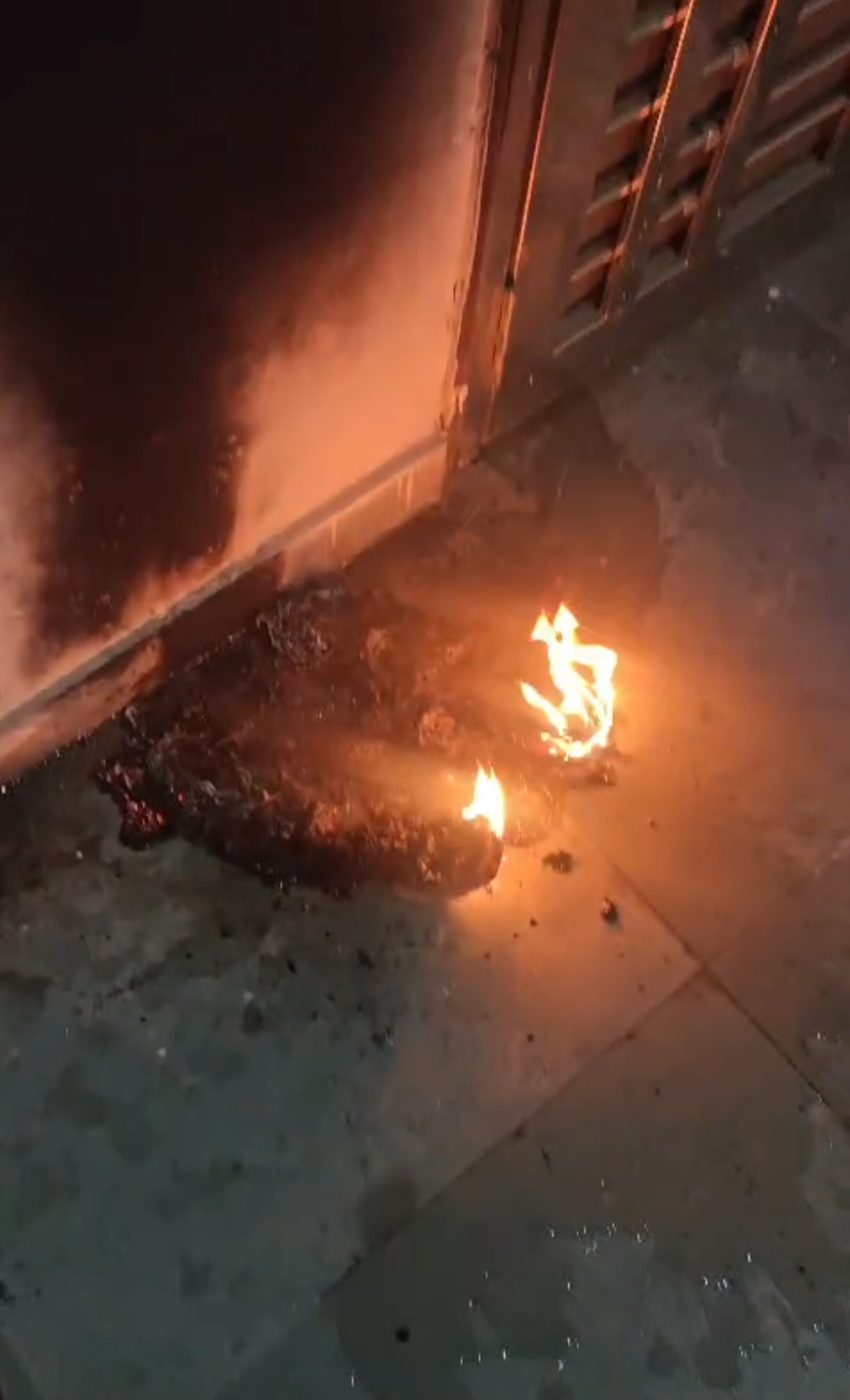 According to residents, unknown individuals set fire to shoes, children’s bicycles, and even wallpaper placed outside apartments in separate towers of the society.
