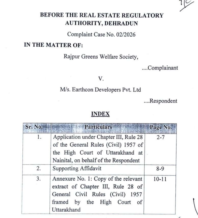 देहरादून के रियल एस्टेट सेक्टर में एक गंभीर विवाद उभरकर सामने आया है, जहां Earthcon Developers Pvt. Ltd. के राजपुर क्षेत्र स्थित रायपुर ग्रीन्स (राजपुर ग्रीन सोसाइटी) प्रोजेक्ट के रेजिडेंट्स ने व्यापक अनियमितताओं और वादाखिलाफी के आरोप लगाते हुए RERA का रुख किया है। जिस प्रोजेक्ट को आधुनिक सुविधाओं और प्रीमियम लाइफस्टाइल के नाम पर बेचा गया था, वही अब निवासियों के लिए “संघर्ष और असुविधा का केंद्र” बनता जा रहा है।