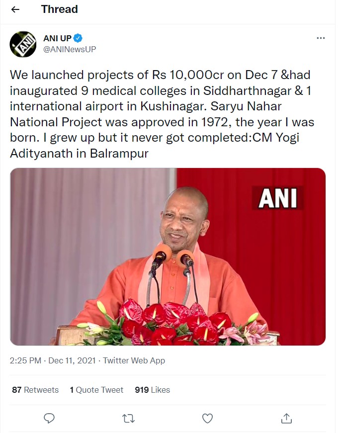 Despite being inaugurated in 1972, the year he was born, he claims the project is still unfinished. In Balrampur, Yogi Adityanath said, “I grew up but it never got done.”