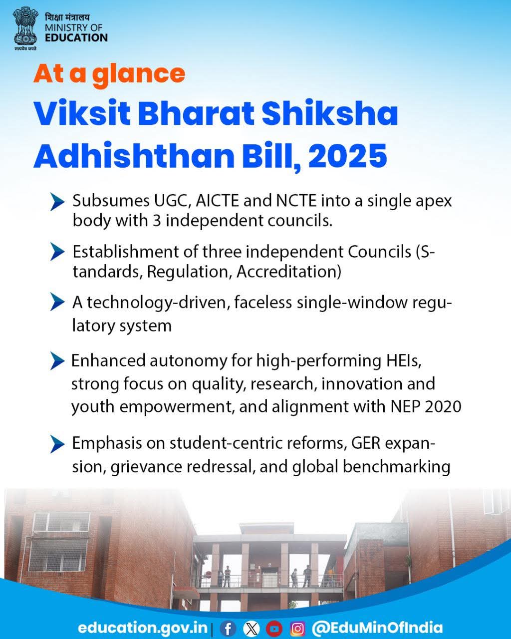 The Bill emphasizes student-centric, holistic education reforms aimed at improving access, boosting skill development, and preparing learners for future-ready careers. A robust grievance redressal mechanism, focus on emerging disciplines, and inclusive education models are expected to strengthen India’s human capital and support the goal of Atmanirbhar Bharat.