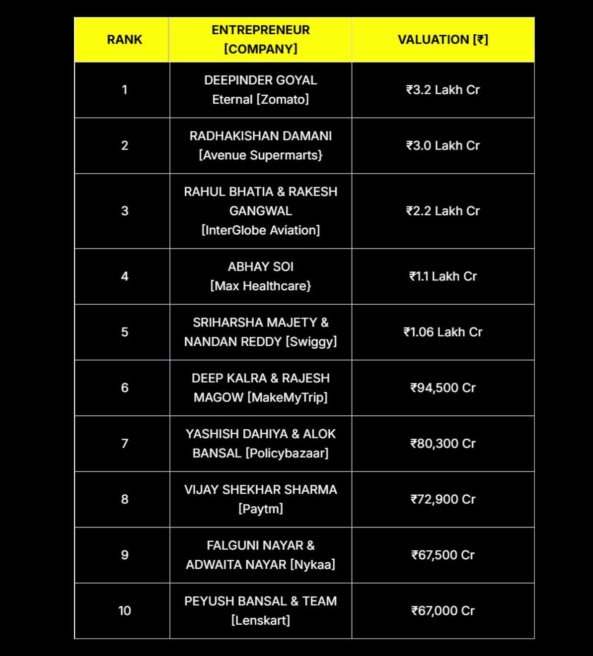 Food-tech rival Swiggy secured fifth place, with founders Sriharsha Majety and Nandan Reddy valued at Rs 1.06 lakh crore, driven by Swiggy’s expansion into quick commerce and grocery delivery.